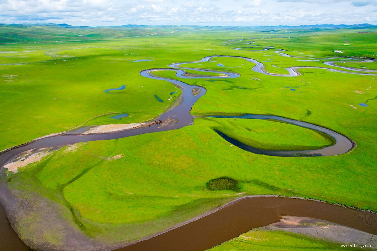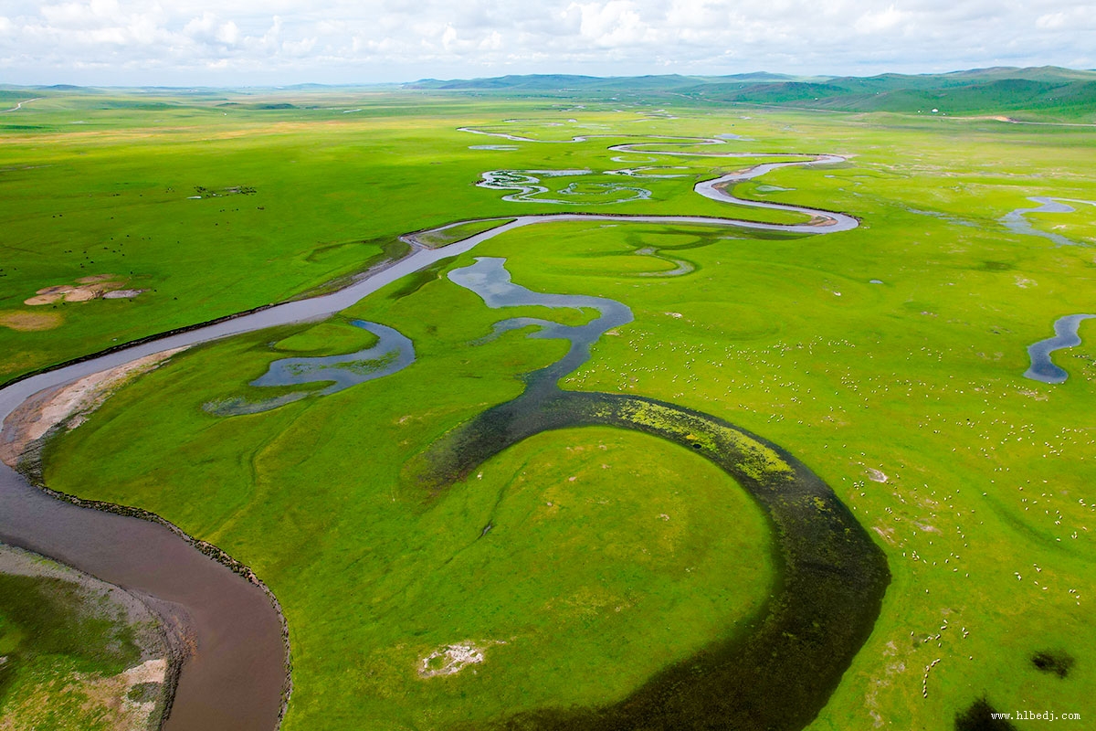 她就仿佛是草原上一條盤旋的玉嬌龍,每天在草原上盡情地展現(xiàn)著自己的嫵媚身姿。河道十分狹窄,但卻極度彎曲的河流.如果從空中俯瞰,蜿蜿蜒蜒的河水,就象是一條被勁風(fēng)舞動(dòng)著的蔚藍(lán)色綢帶,悠然飄落在碧綠如玉平坦無垠的大草原上,一會(huì)兒東行,一會(huì)兒西走,一會(huì)兒南奔,一會(huì)兒北進(jìn),其彎曲程度,用九曲十八彎來形容是遠(yuǎn)遠(yuǎn)不夠的。